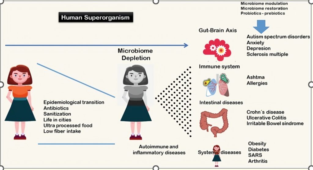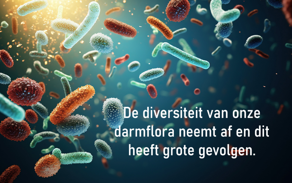 Factoren als het veelvuldig gebruik van antibiotica, een overdreven hygiëne (2-3 x per dag douchen met zeep bijvoorbeeld wat erg slecht is voor je huidflora.), het leven in steden, ultrabewerkte voeding en een lage hoeveelheid inname van vezels hebben grote gevolgen voor onze darmflora. Dit zorgt voor een uitputting van het microbioom.