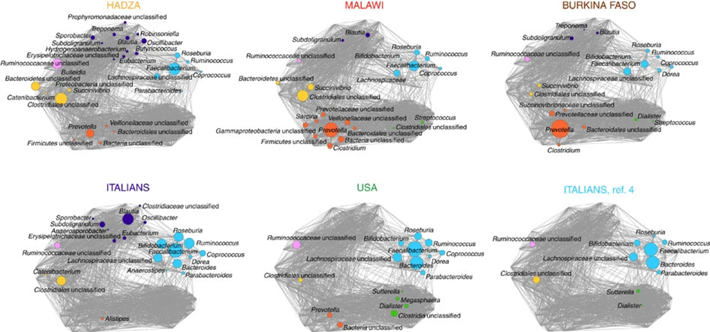 In een ander onderzoek werd de darmdiversiteit van verschillende bevolkingsgroepen met elkaar vergeleken (3). De uitkomst is visueel weergegeven in een zogeheten Wiggum-plot: elke stip staat voor een bacteriegroep. Wat je daar ziet is veelzeggend; de bovenste drie grafieken tonen traditionele volkeren, de onderste drie mensen uit grote steden. Het verschil in diversiteit is in één oogopslag zichtbaar.