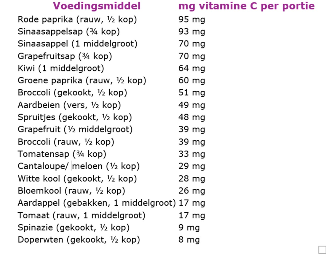 Volgens de Gezondheidsraad bedraagt de aanbevolen dagelijkse hoeveelheid vitamine C voor volwassenen: 75mg. (9) Let wel; deze aanbevolen dagelijkse hoeveelheid is gericht op het voorkomen van een risico op een klacht. Dat is dus het absolute minimum.