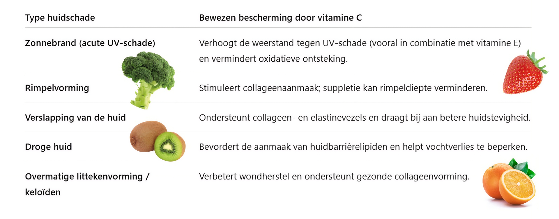 Maar collageen is niet alleen belangrijk voor wondgenezing. Het bepaalt ook huidstevigheid, elasticiteit en herstelvermogen. Vitamine C ondersteunt dus letterlijk de structuur van je lichaam.