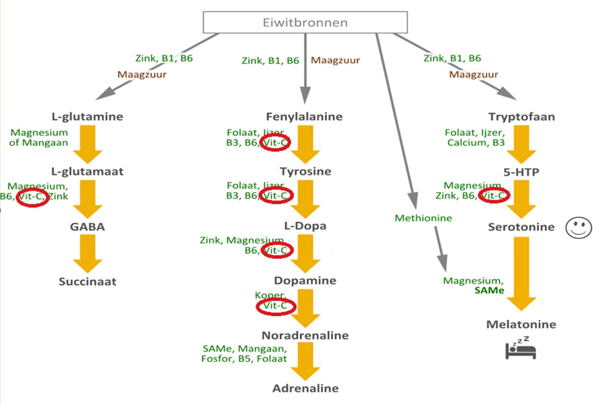 Voor de aanmaak van serotonine, dopamine en melatonine zijn naast aminozuren meerdere cofactoren nodig. (2). Niet alleen vitamine C (rode cirkel in het plaatje hieronder) is daarbij belangrijk, maar ook verschillende B vitamines en magnesium
