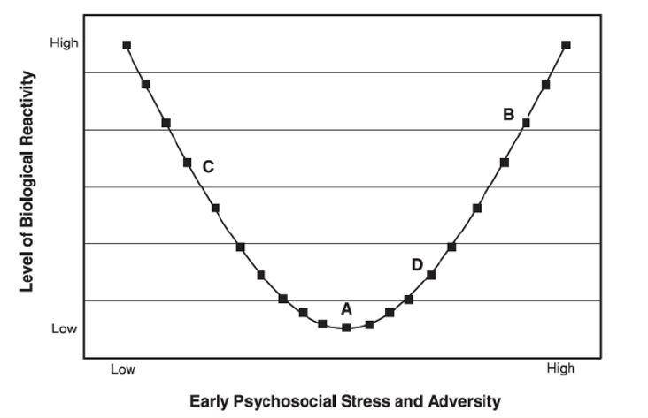In het plaatje hieronder uit deze studie is dat mooi weergegeven. (2) Hoe meer psychologische stress gedurende de jeugd (B), hoe groter de ‘biologisch reactiviteit’ oftewel hoe meer het zenuwstelsel uit balans raakt. Als je goed kijkt zie ook dat heel weinig stress gedurende de jeugd ook niet optimaal is. Een klein beetje stress/cognitieve uitdaging is dus uiteindelijk essentieel voor onze weerbaarheid in hert latere leven. (!)
