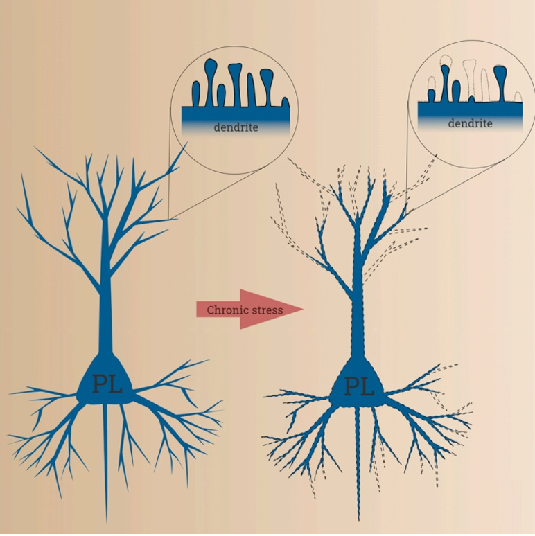 De afbeelding toont twee piramidale neuronen (PL). Dit zijn zenuwcellen die een cruciale rol spelen in geheugen, emotie en cognitieve functies.